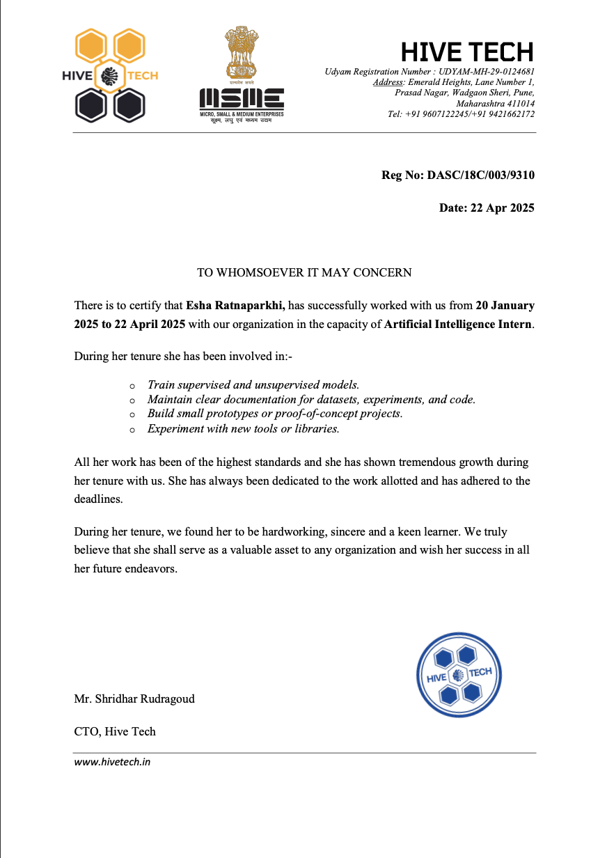 During my internship at HiveTech, I worked on training and experimenting with machine learning models for exploratory AI applications. The role focused on building small prototypes, conducting model experimentation, and maintaining structured documentation for datasets, experiments, and development workflows.