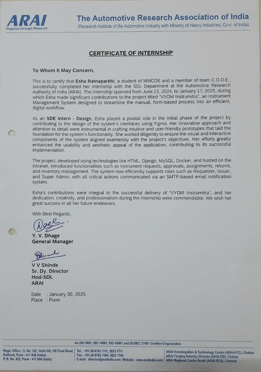 Completion certificate issued by ARAI leadership recognizing contributions to the design and development of the “VYOM Instrumitra” digital instrument management system and its internal workflow automation.